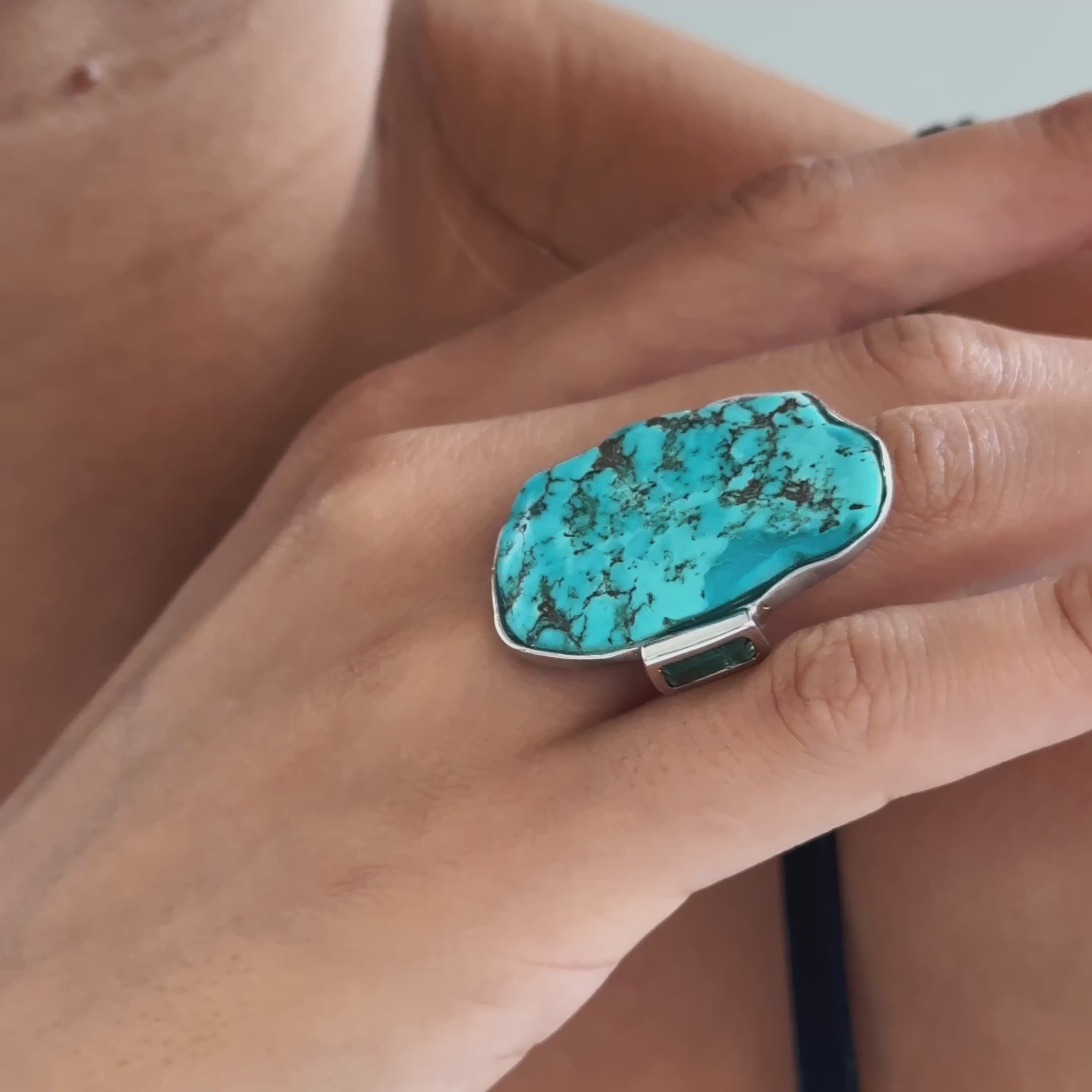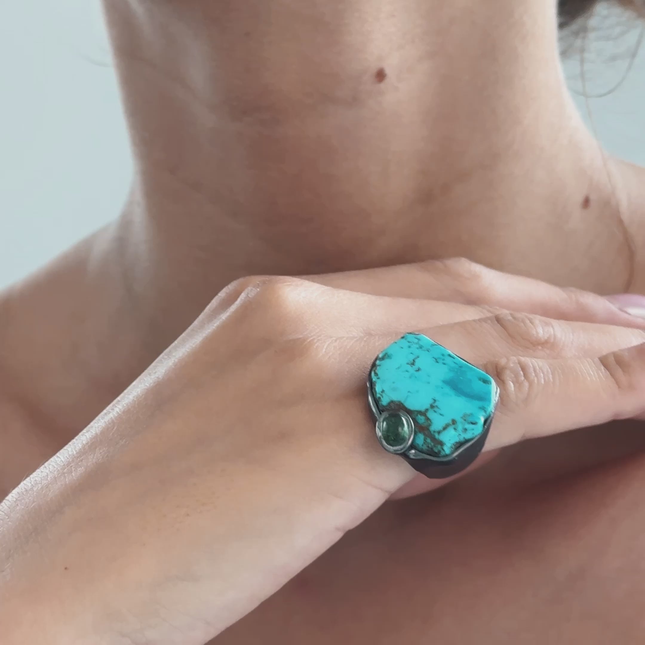 Aarde Black 925 Silver Ring with Rough Turquoise & Green Tourmaline