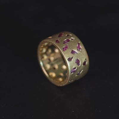 Carisa is a handmade barrel ring covered with raw Ruby pieces set directly into the metal. The rubies are placed all around the band, each in its natural form, without polishing or shaping. Their irregular surfaces stay visible, giving the ring a real mineral feel instead of a uniform gemstone pattern. The sterling silver base is finished with 14K gold plating, adding a warm tone while keeping the overall look matte and grounded. This design is unmistakably Kabirski - organic placement, natural lines, and a structure built around the raw stones rather than symmetry or shine. Carisa is made for people who prefer the look of real, untouched minerals and for those who dislike overly perfect or glossy jewelry. It’s a ring that keeps the stones honest and the style intentionally unpolished. PLEASE NOTE: Raw gemstones naturally show cracks, inclusions, and variations in color. These are not defects - they confirm authenticity. Color may appear different under various lighting conditions; please refer to the model photos for the most accurate representation.