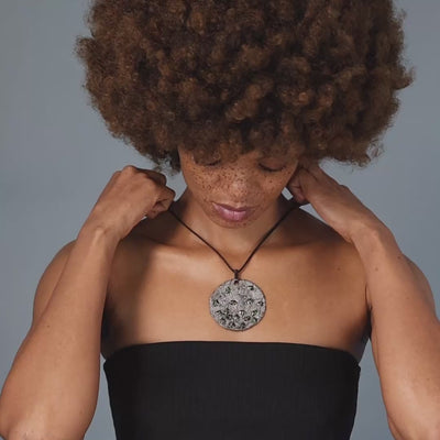 Ajax is a large, circular pendant made as a one-of-a-kind piece. Handcrafted by our designer in black ruthenium-plated sterling silver, it carries 17 natural oval-cut chrome diopsides. Each stone is held in place by a silver string, using a distinct, original setting that’s unmistakably German Kabirski in its construction and attitude. The composition is built on contrast: a clean, controlled circular shape against a restless, almost chaotic cluster of gemstones and the string that binds them, like a plant structure gripping and stabilizing what wants to move. This is art jewelry made as a statement object, created for one person only, because only one exists and it will never be repeated.
