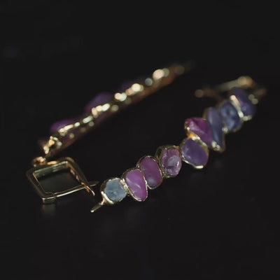 Thera highlights the natural beauty of raw pink sapphire—a soft, bright pink that looks completely different when left unpolished. The stones are used exactly as they come from the earth, so the earrings show real mineral texture rather than the smooth surface of a cut gem. The sapphires are arranged in a loose, dangling cluster that moves easily and creates a clean, contemporary silhouette. Each raw stone is held in 14K gold plated sterling silver, adding a warm tone that complements the natural pink without overpowering it. A push-back lock keeps the earrings secure and comfortable for everyday wear. Because no two raw sapphires are the same, every pair of Thera earrings turns out slightly different, giving each set a limited-edition feel and a unique character. PLEASE NOTE: Raw gemstones naturally show cracks, inclusions, and variations in color. These are not defects - they confirm authenticity. Color may appear different under various lighting conditions; please refer to model photos for the most accurate representation.