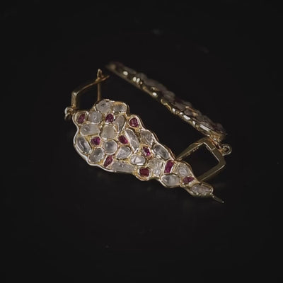 Raw Natural White Zircon and raw Ruby come together in these long, shifting dangle earrings. The stones sit in their original forms — uneven, textured, and unpolished — giving the piece a natural, tactile feel. Zircon adds bright white mineral sparkle, while ruby brings sharp red points that break up the arrangement in a lively, organic way. Each crystal is individually wrapped and connected in sterling silver, then plated with 14K gold. The construction keeps the gems exposed rather than hidden, with no attempt to force symmetry or perfection. The movement, the irregularity, and the raw surfaces create a look that is immediately recognizable as Kabirski — natural stones, honest placement, and a design that refuses to look traditional. PLEASE NOTE: Raw gemstones naturally show cracks, inclusions, and variations in color. These are not defects — they confirm authenticity. Color may appear different under various lighting conditions; please refer to the model photos for the most accurate representation.