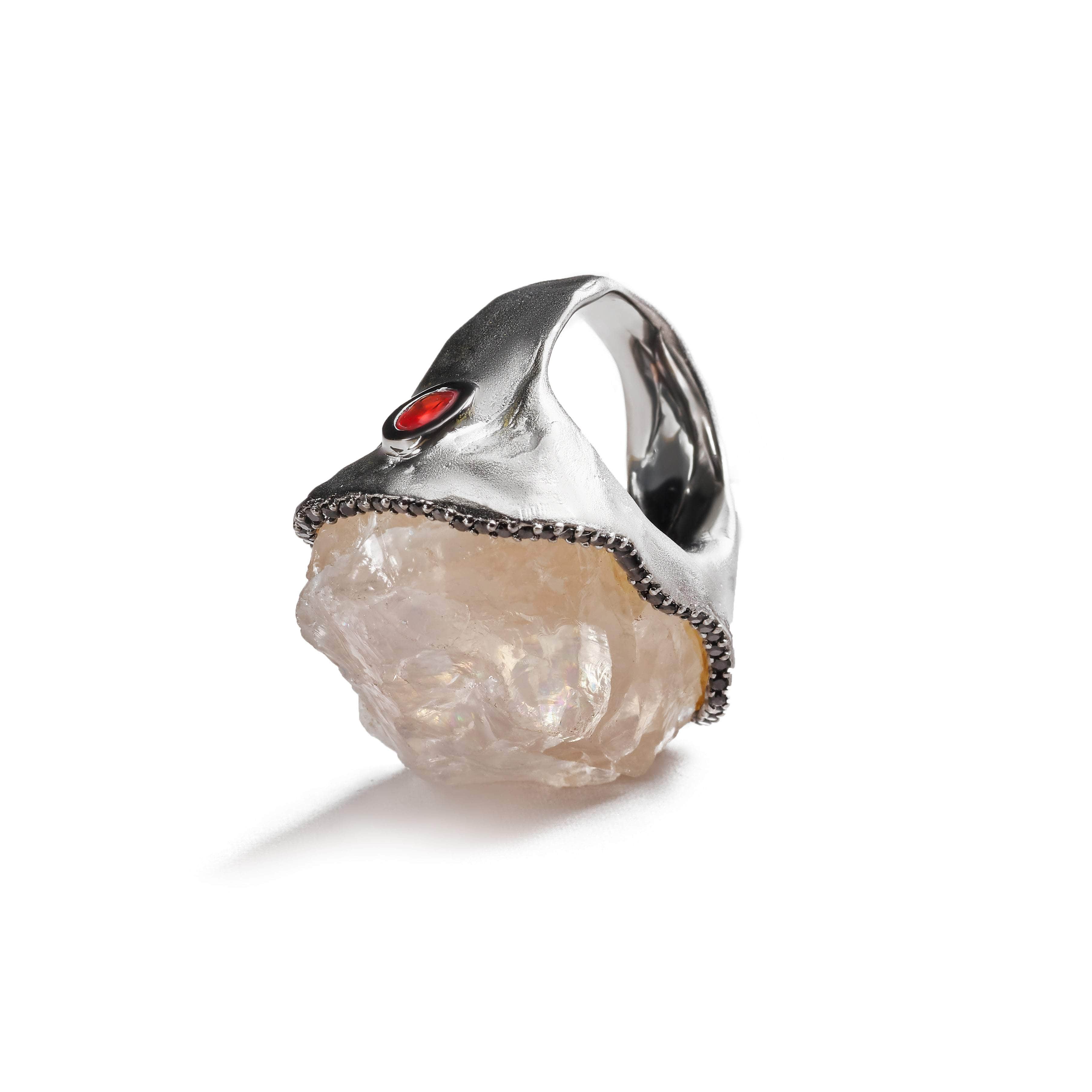 Red sapphires add an element of unique brilliance to this black rhodium ring. Black spinels trace around the border of a raw organic clear quartz gemstone. It dominates and pervades with stunning beauty.