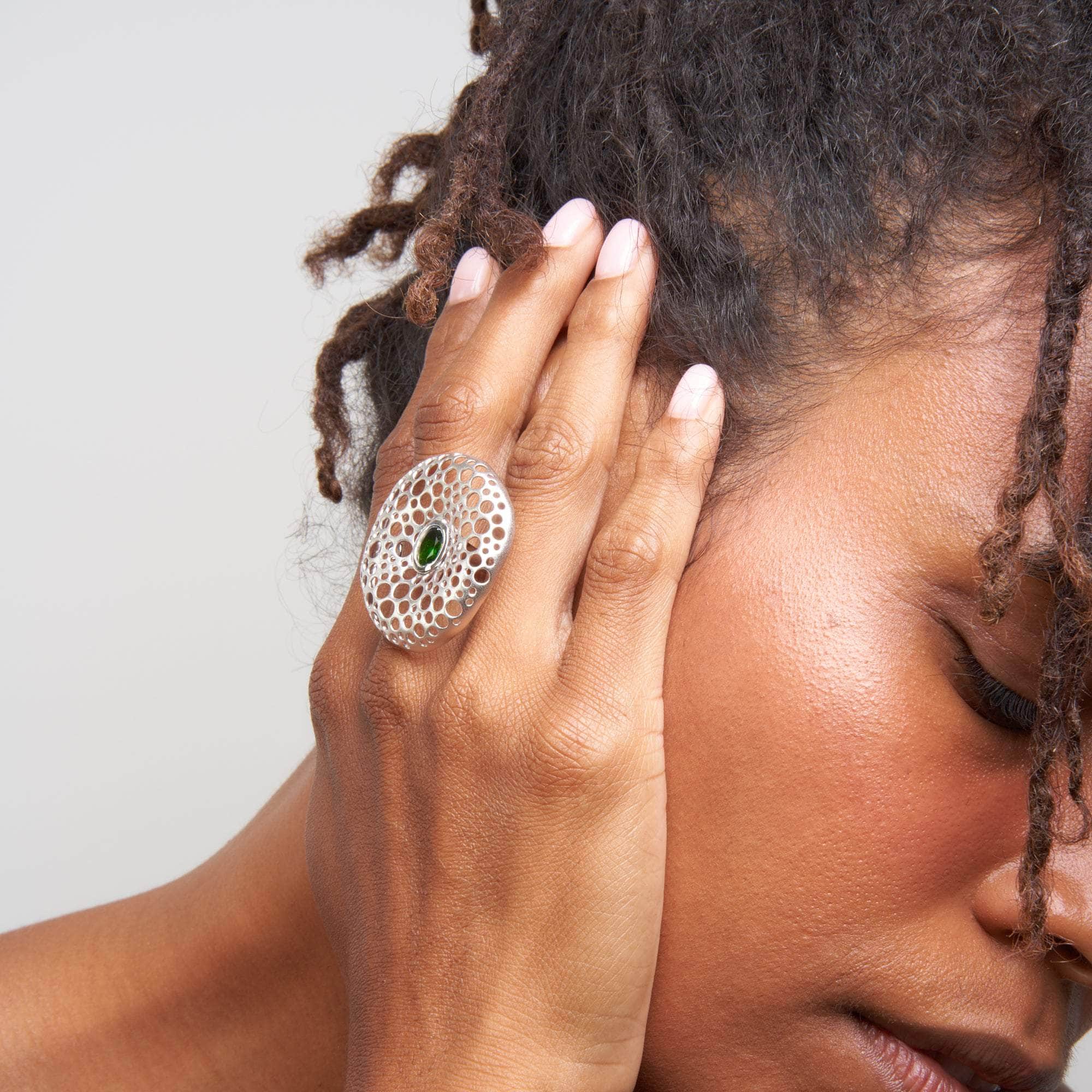 One-piece-only exclusive ring with a natural green oval-cut chrome diopside at the center of the alien-looking perforated silver surface - to reflect and absorb light, energy, and attention. This piece is designed as a single copy and won't be re-produced.