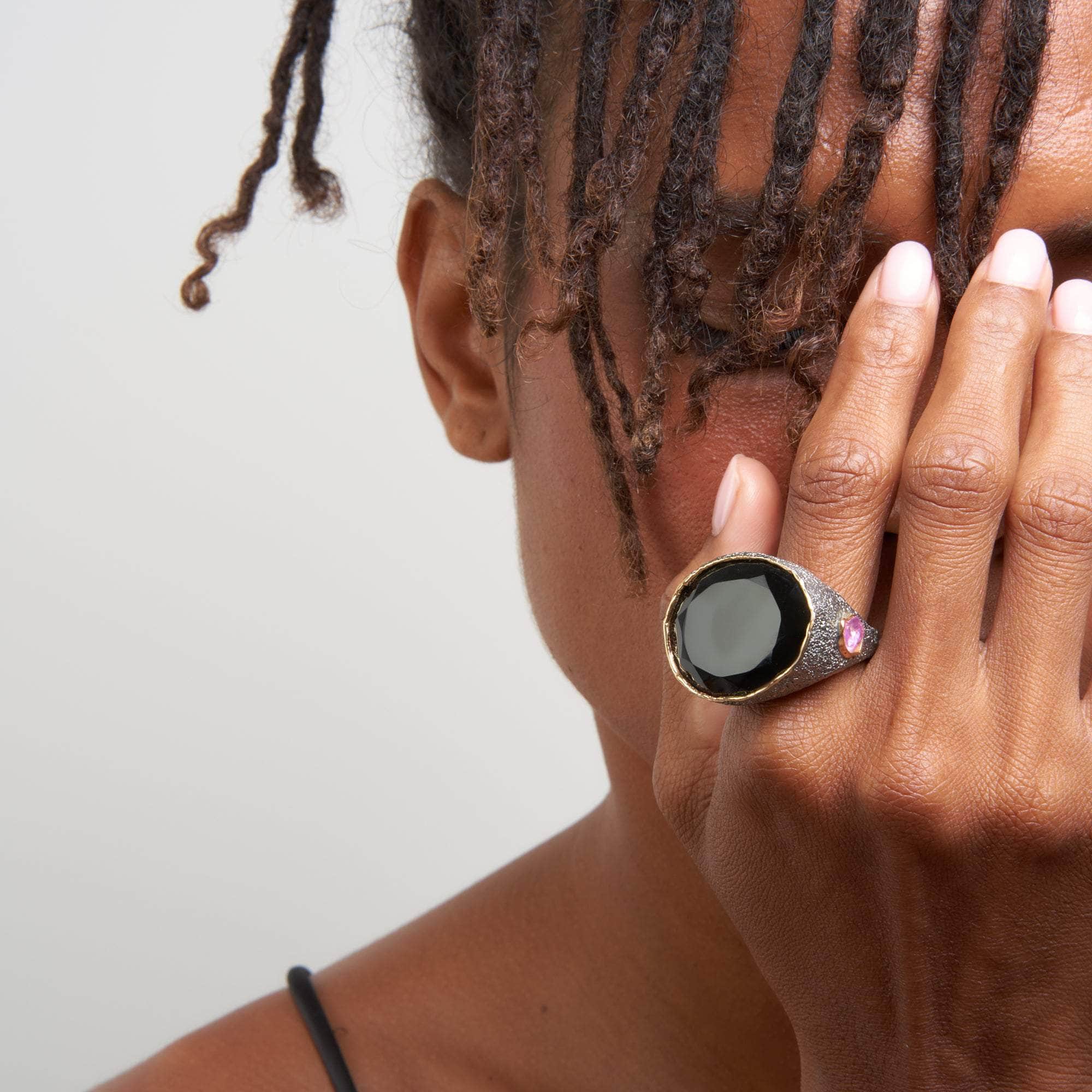 Dark and deep massive smoky quartz crystal framed in blackened silver and gold, with a little raw pink sapphire accent on the side - for the best secret keepers on Earth. This ring is designed as a one-piece-only collectible, with no second copy available.