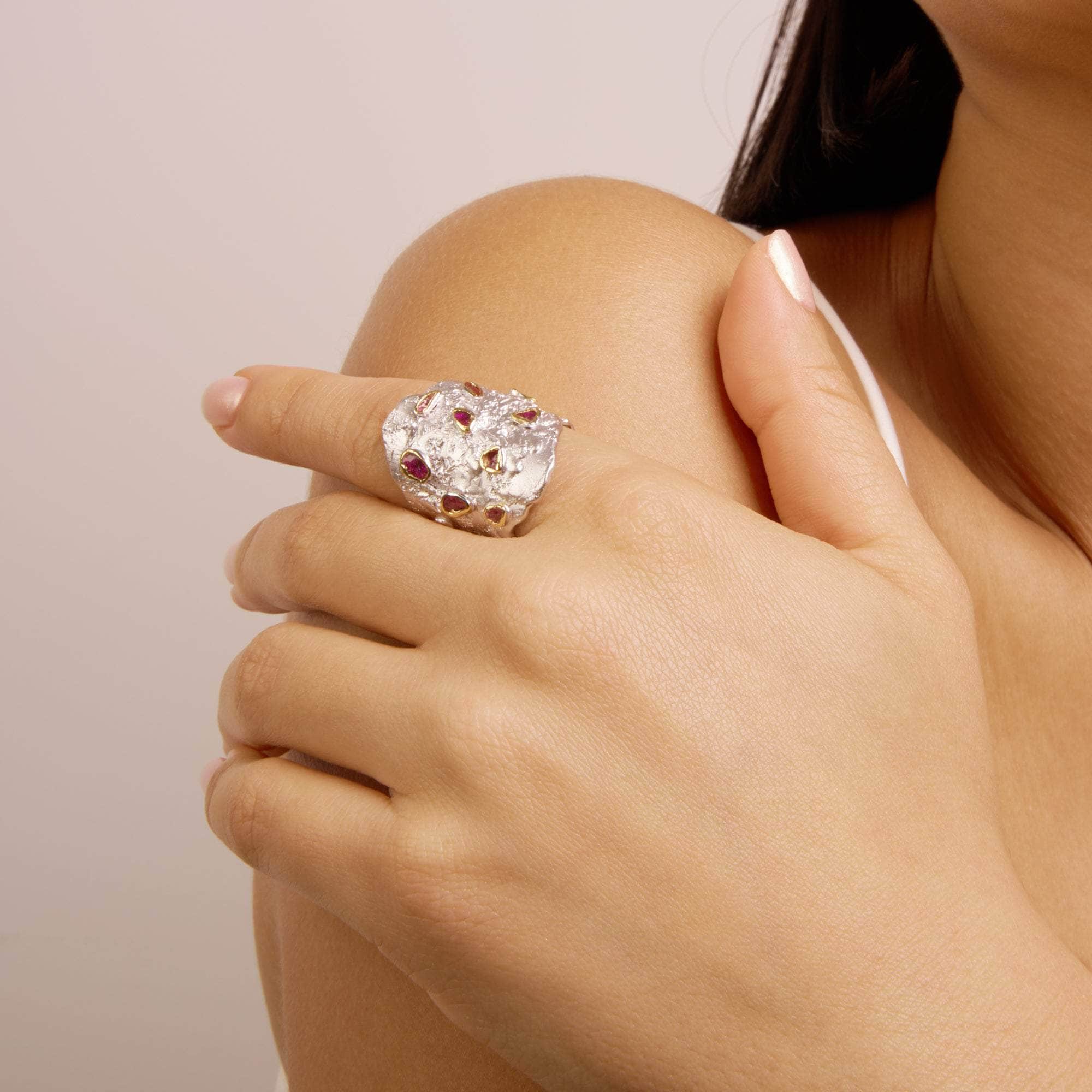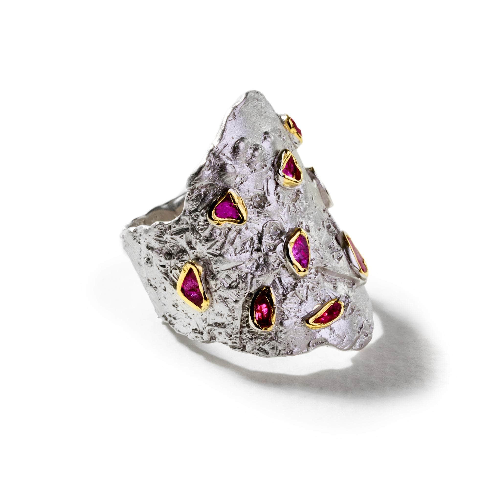 Meet very odd, very German Kabirski design featuring his hallmark organic metal texture, as a testament to chaotic artistry. Adorned with raw, unspoiled ruby crystals set in an unprecedented, unconventional manner, this ring challenges the norms of traditional jewelry. This singular art jewelry piece with no duplicates in existence celebrates the artisan's touch.