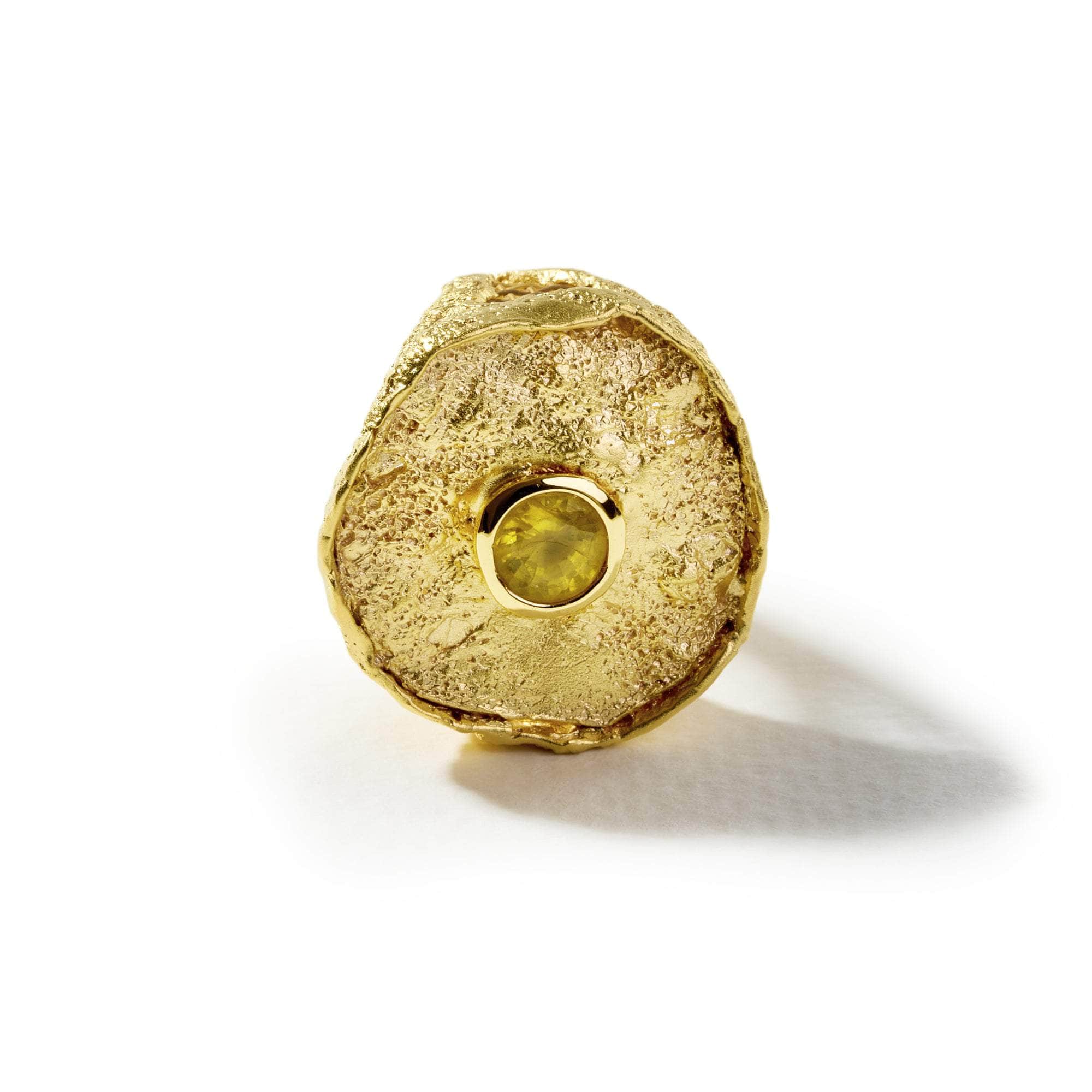 A provocative departure from convention: a designer ring fashioned from silver and titanium mesh, fully plated in 18K gold, starring a bold round-cut yellow sapphire. This striking gemstone serves as a contemporary amulet, guarding against the tide of mainstream fashion. This piece of wearable art stands alone, with no duplicates in existence.