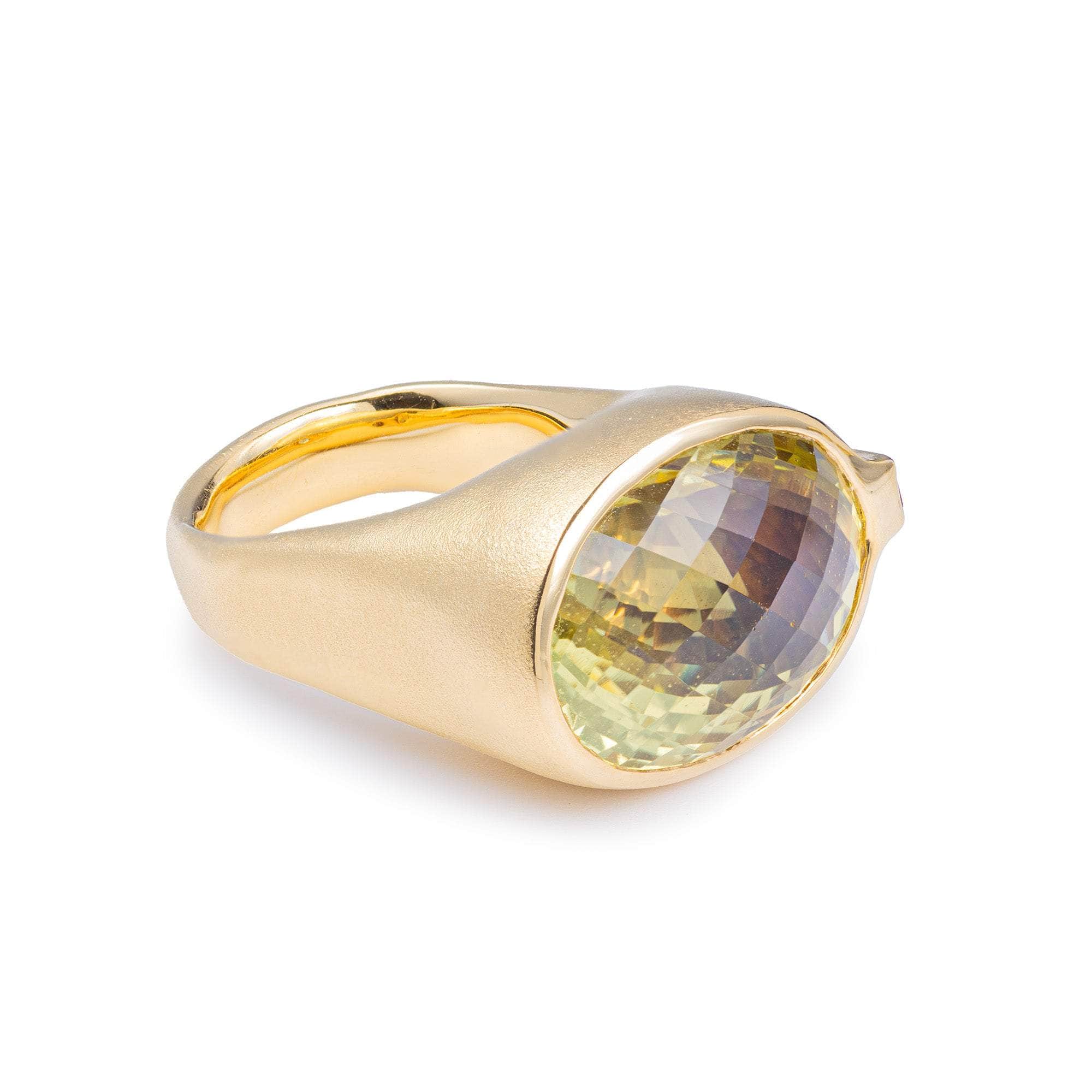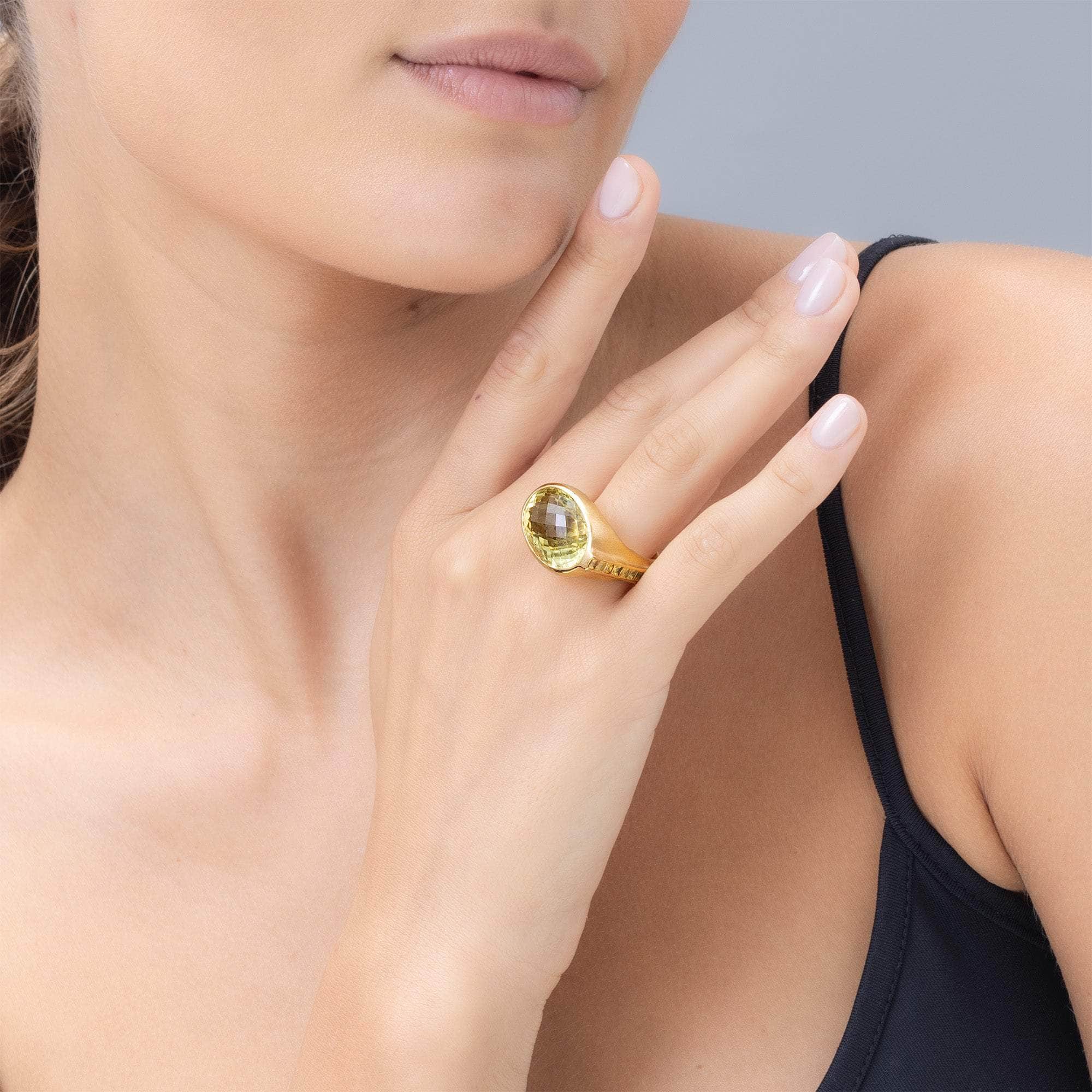 Exclusive German Kabirski ring featuring a bold, oval-cut Lemon Quartz centerpiece, set on a silver band fully plated in 18K gold and lined with princess-cut Yellow Sapphires for added brilliance. Designed to be as striking and unique as its wearer, this one-of-a-kind piece has no duplicates - crafted for those who dare to stand out with distinctive, collectible jewelry.