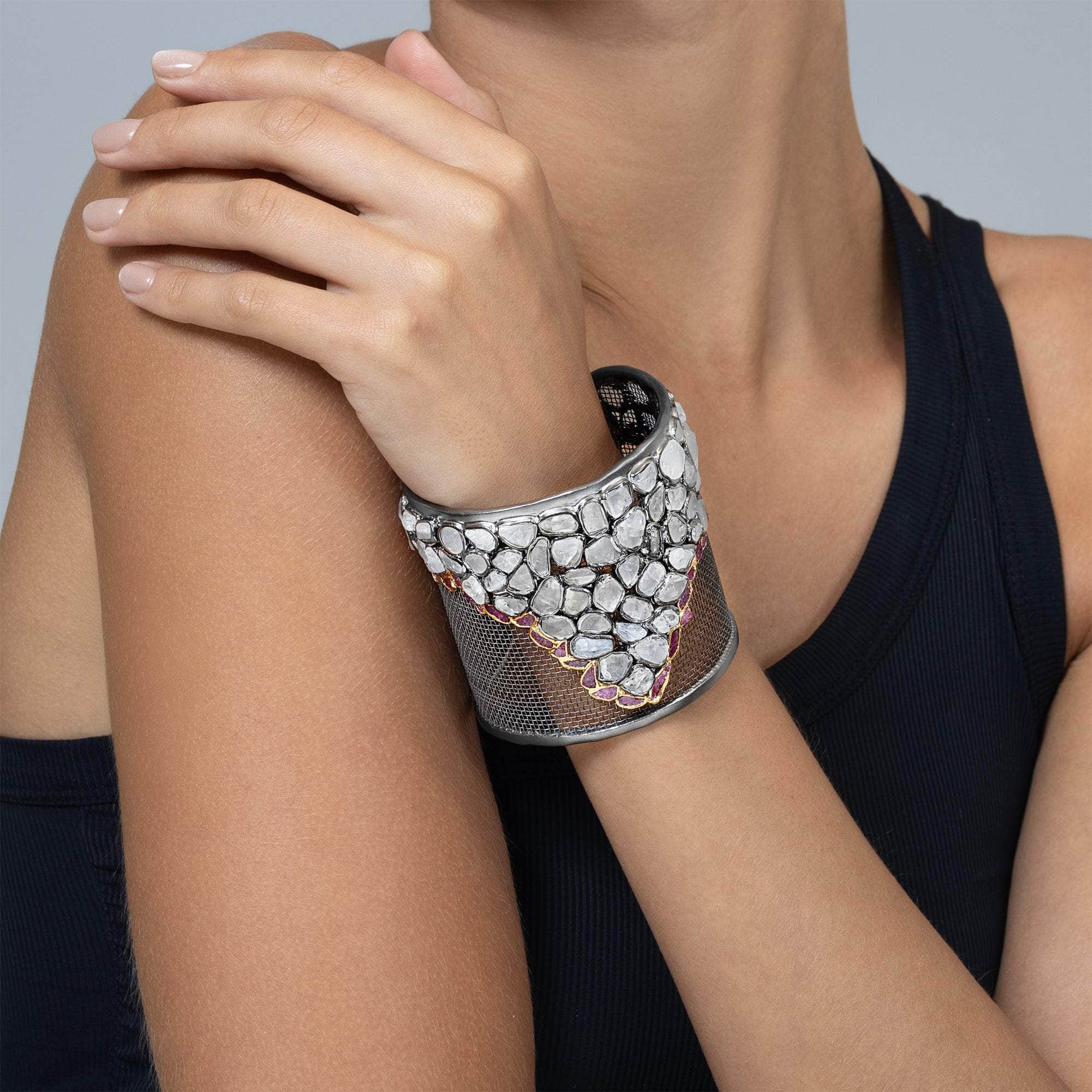 This unique contemporary designer bracelet is a one-of-a-kind creation, crafted from an unconventional blend of 925 silver and titanium mesh. It features raw white sapphires and rubies, set using German Kabirski's innovative Stained Glass technique. The natural, untreated gemstones retain their wild energy, making this bracelet a distinctive piece of wearable art that ensures you stand out.