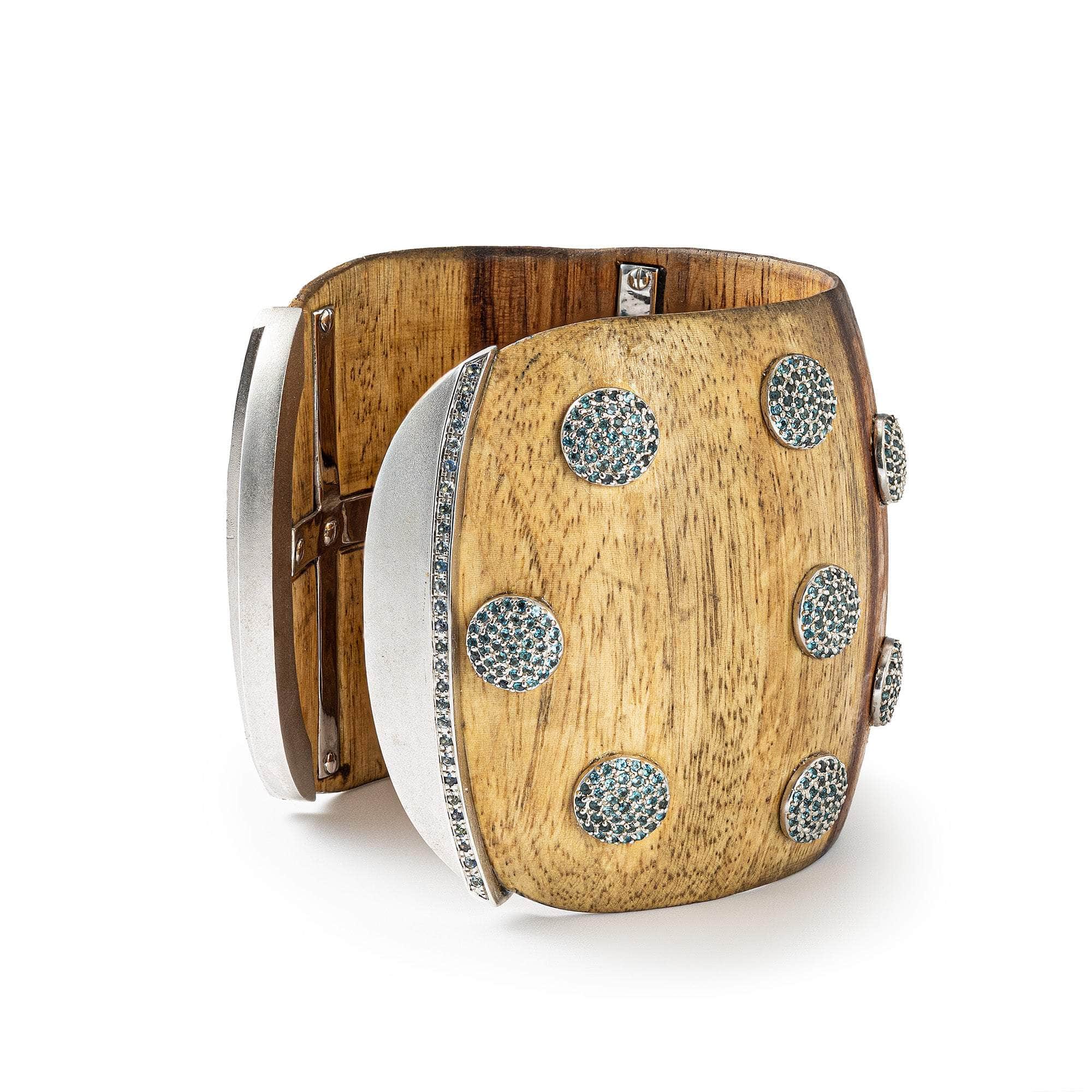 This Rosewood bracelet is a unique expression of German Kabirski's affinity for natural, warm materials like wood. Combining Rosewood with 925 Silver plated in White Rhodium and accented with nuggets set with Blue Sapphires, it showcases an unusual blend of materials and Kabirski's distinctive style. This exclusive, one-of-a-kind design is crafted for an individual who values the beauty of nature and the art of innovation.