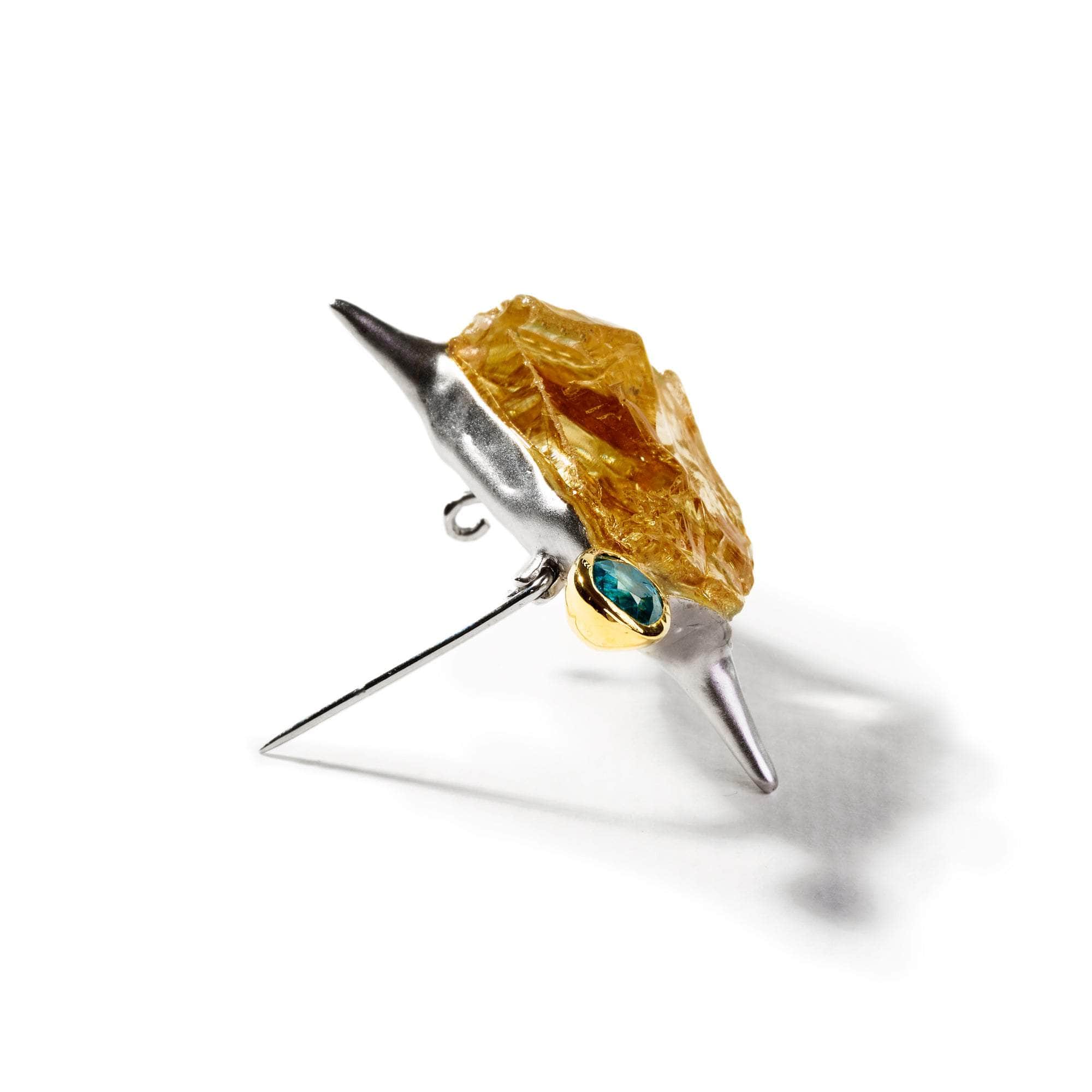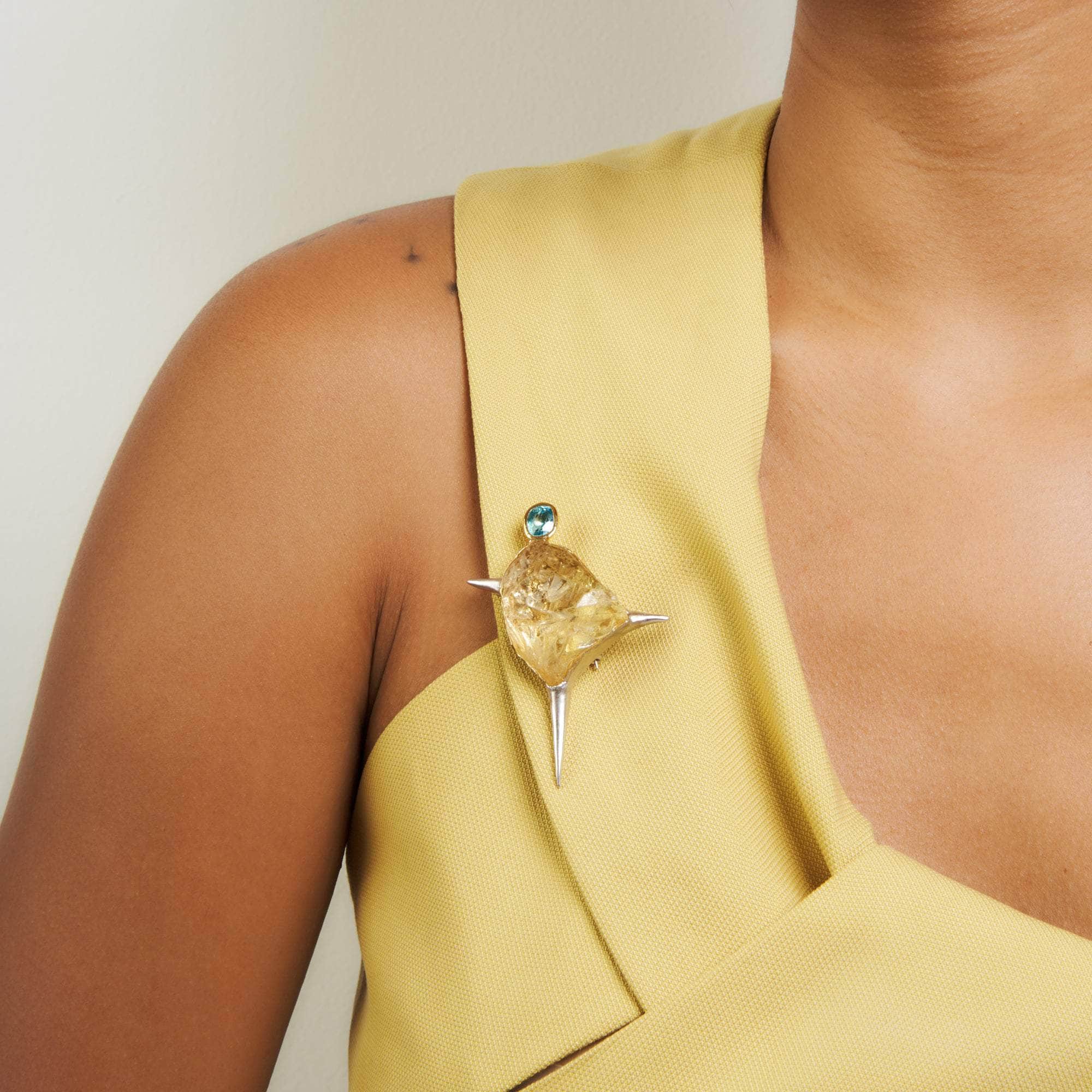 The focal point of this contemporary designer brooch is a captivating lemon quartz crystal, in its original uncut form, representing the beauty found in nature's rawness. Alongside the lemon quartz, an oval-cut blue topaz provides a striking contrast, adding a touch of color and refinement. This jewelry piece embraces the beauty of simplicity and celebrates the unconventional.