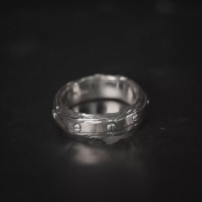 The Karna ring carries a quiet toughness. Made from oxidized 925 silver, its thin band is marked by a rough, layered surface and scattered rivet-like details that feel almost architectural—like something once functional, now reimagined as jewelry.