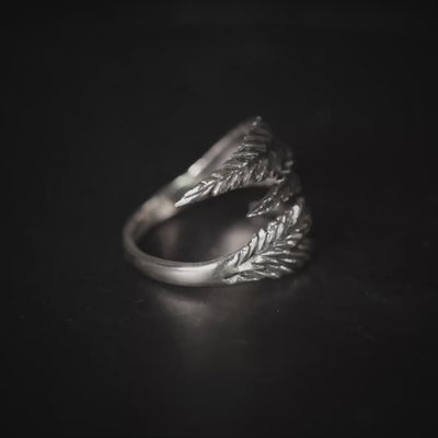 The Skadi ring is built from a series of elongated, overlapping leaves, stacked like layers of worn armor or wild foliage. Cast in oxidized 925 silver, the texture is sharp but natural—raw edges, uneven flow, and a sense of quiet movement.
