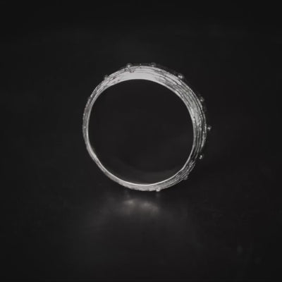 The Flumen ring is slim but far from simple. Crafted from oxidized 925 silver, it features a layered, weathered surface accented with subtle rivet-like forms that give it a raw, industrial feel.