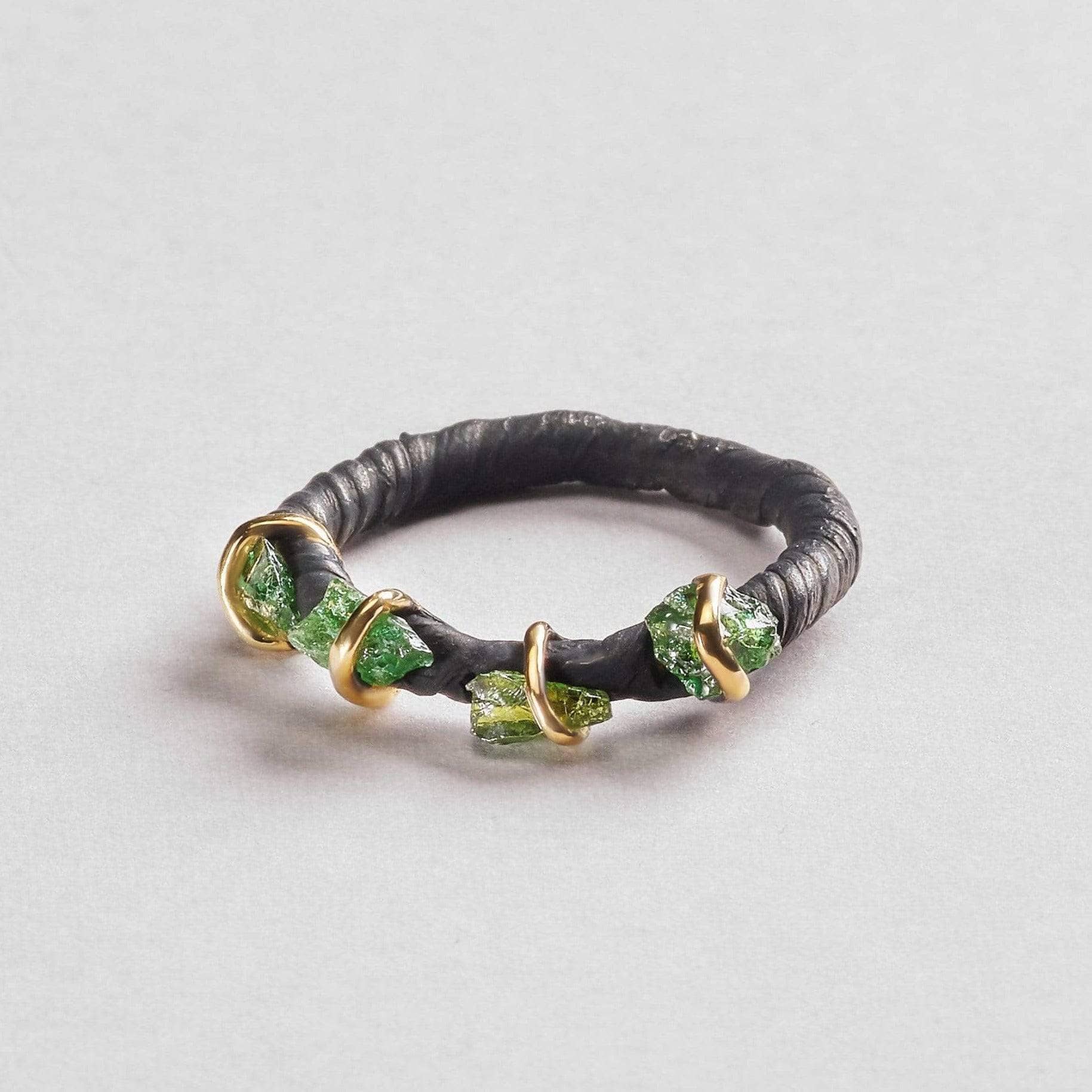 A gorgeous band of black anthracite has a strength and majesty as it allows gemstones to sit upon its crest. It has several pretty jewels arranged in a line along its arc. Each are wrapped in a sinew of looping delicate gold.