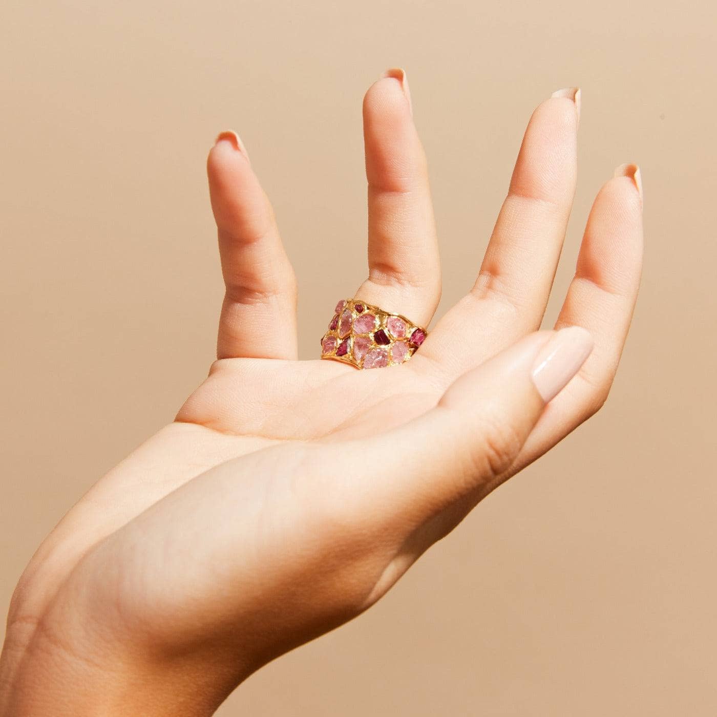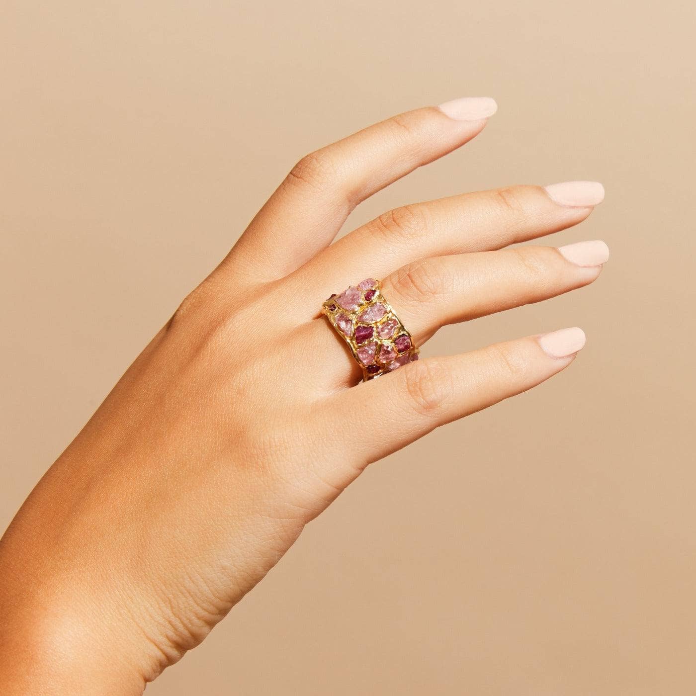 The Alcina ring is heavy with color. Rough ruby and raw pink sapphire are set close together in a wide barrel-shaped band, each stone left in its natural state - uncut, uneven, and full of life. There’s nothing delicate about it, but it still catches light in a way that feels unexpected.