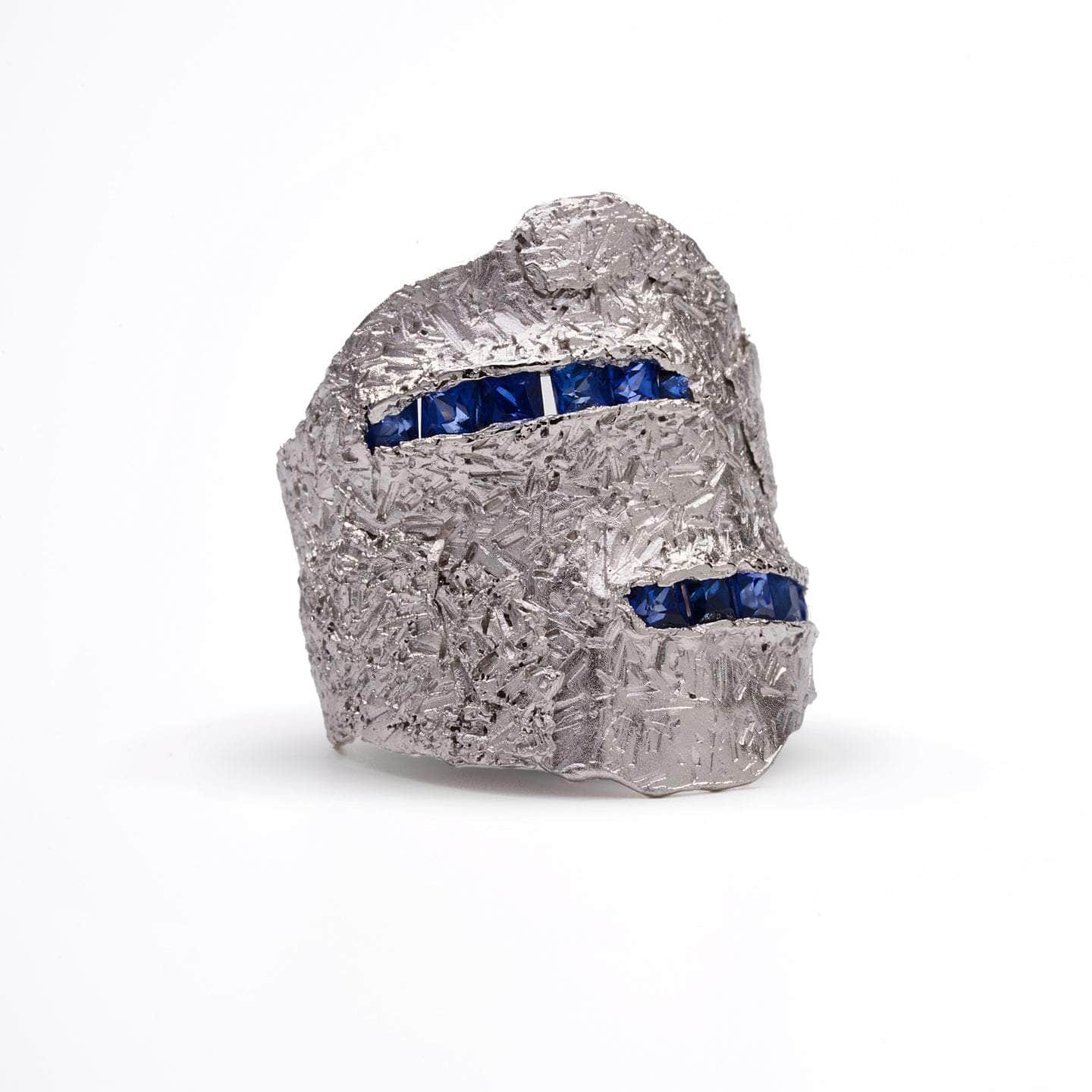 Slices of electric blue sapphire streak their way across a rhodium sky. The treasures of the earth are painted across the landscape of this ring in gemstones of brilliant bright color.
