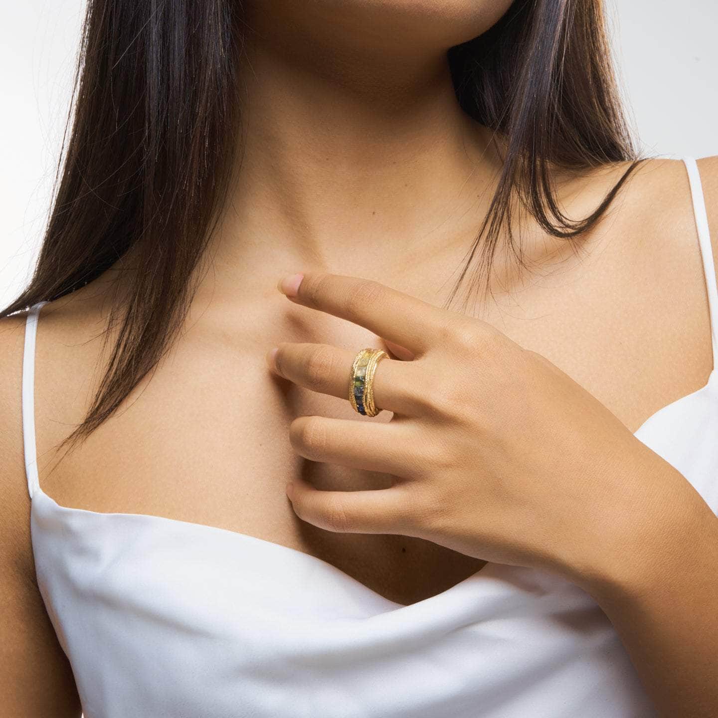 Minimalistic design made to capture everyone's attention by the combination of lively colored all-natural raw gemstones on an 18K gold-plated silver band. This design is handmade and individually crafted, so it might look slightly different from the picture. There will never be two completely identical pieces, so yours will always have one of a kind. Â