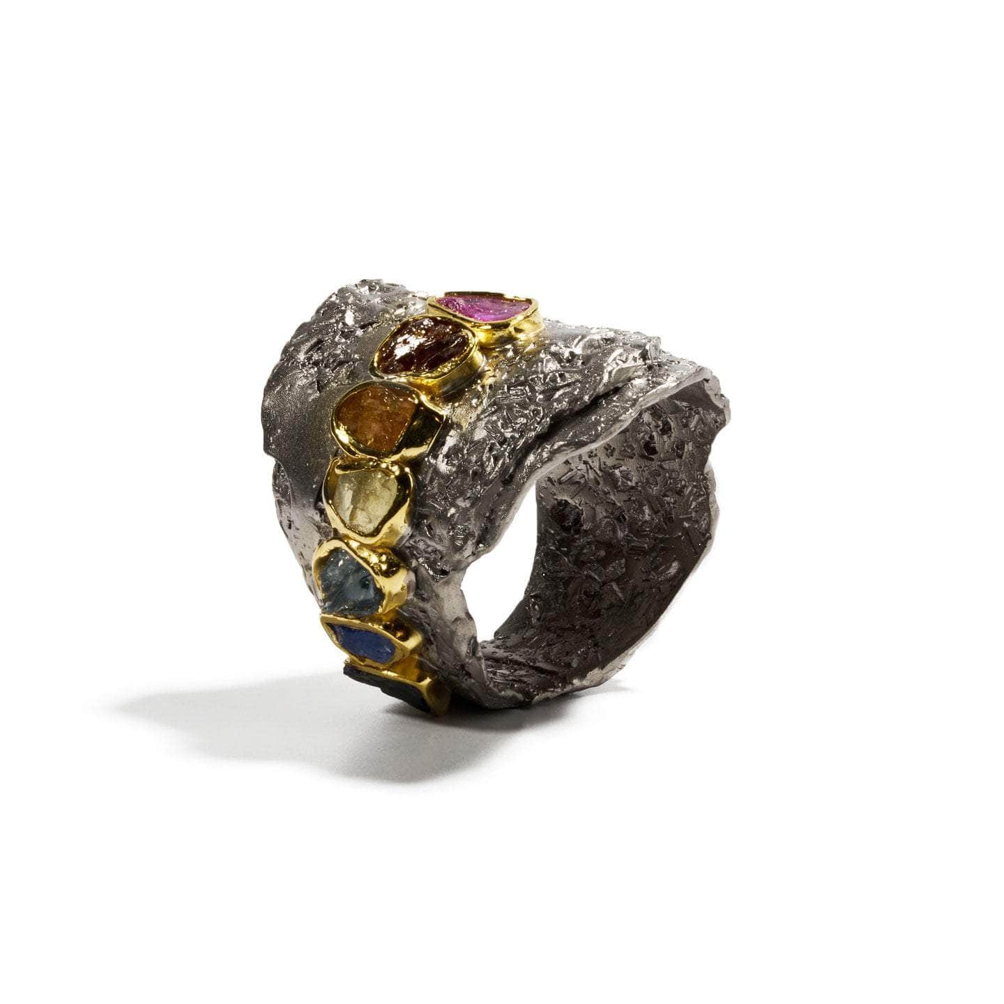 The earthy power of the seven raw crystals enhances the stamina of everyone who touches this ring's dark, rough surface. Are you a believer? This design is handmade and individually crafted, so it might look slightly different from the picture. There will never be two completely identical pieces, so yours will always have one of a kind.