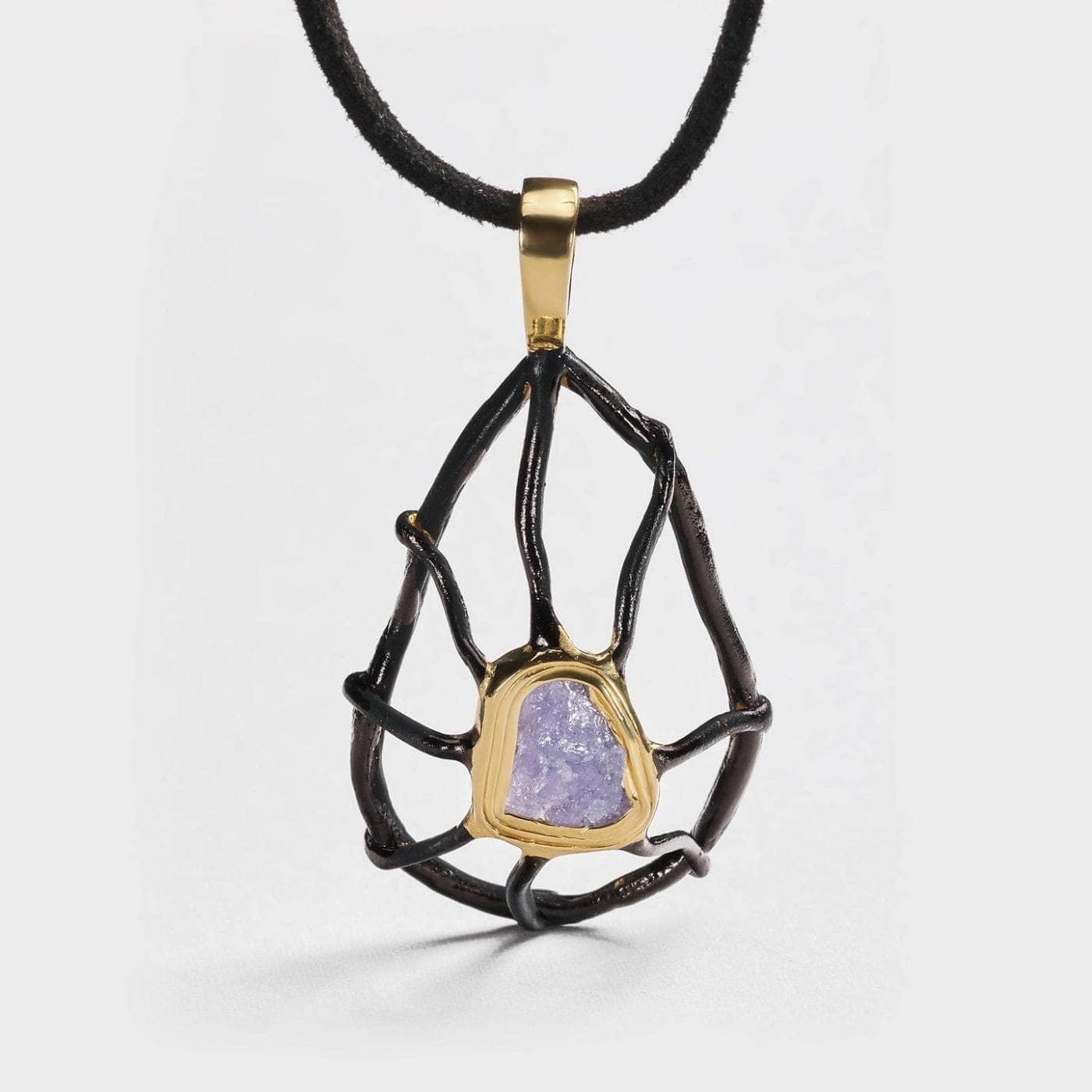 Is it a child's drawing of the Sun cast in silver? A natural raw tanzanite centerpiece framed in gold proves that children can catch the essence of things. Also available with chrysoberyl and ruby