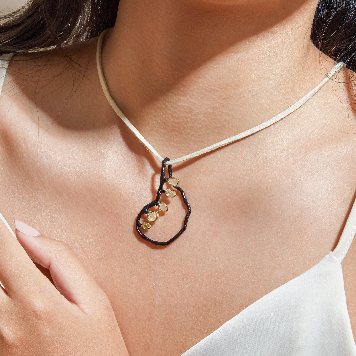 Deep-black anthracite plating is one of German Kabirski's design inventions, our in-house secret know-how. We use it in combination with gold and raw natural gemstone crystals to create organic jewelry for those who love nature and life itself. Wear this uncut precious chrysoberyl pendant to express your values and be different.