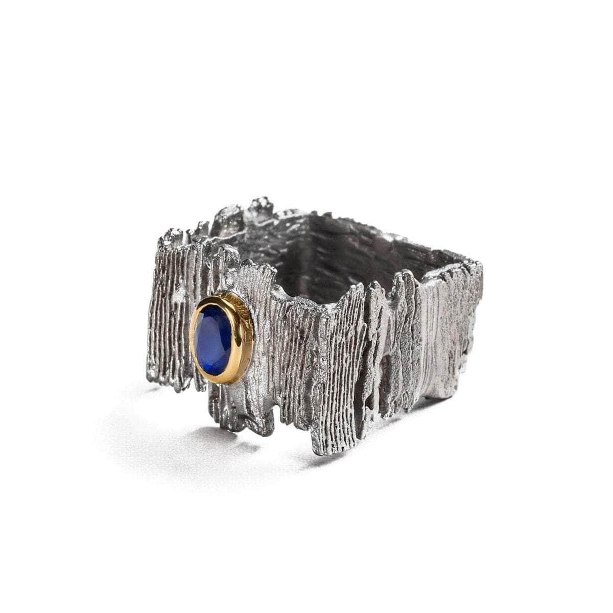 Following a square shape this dramatic ring has an impact and personality all its own. A shimmering sapphire nestles atop the band surrounded by textured sections of black rhodium that are engraved with organic shape and line. A gleam of gold adds intensity to the entire ring with its bright glimmer against the depth of dark precious metal.