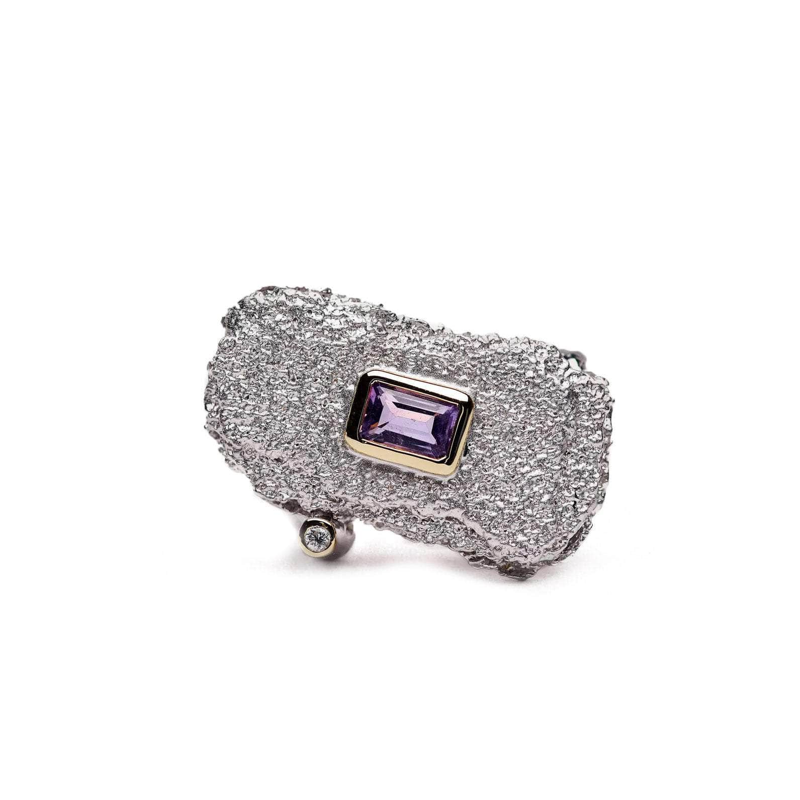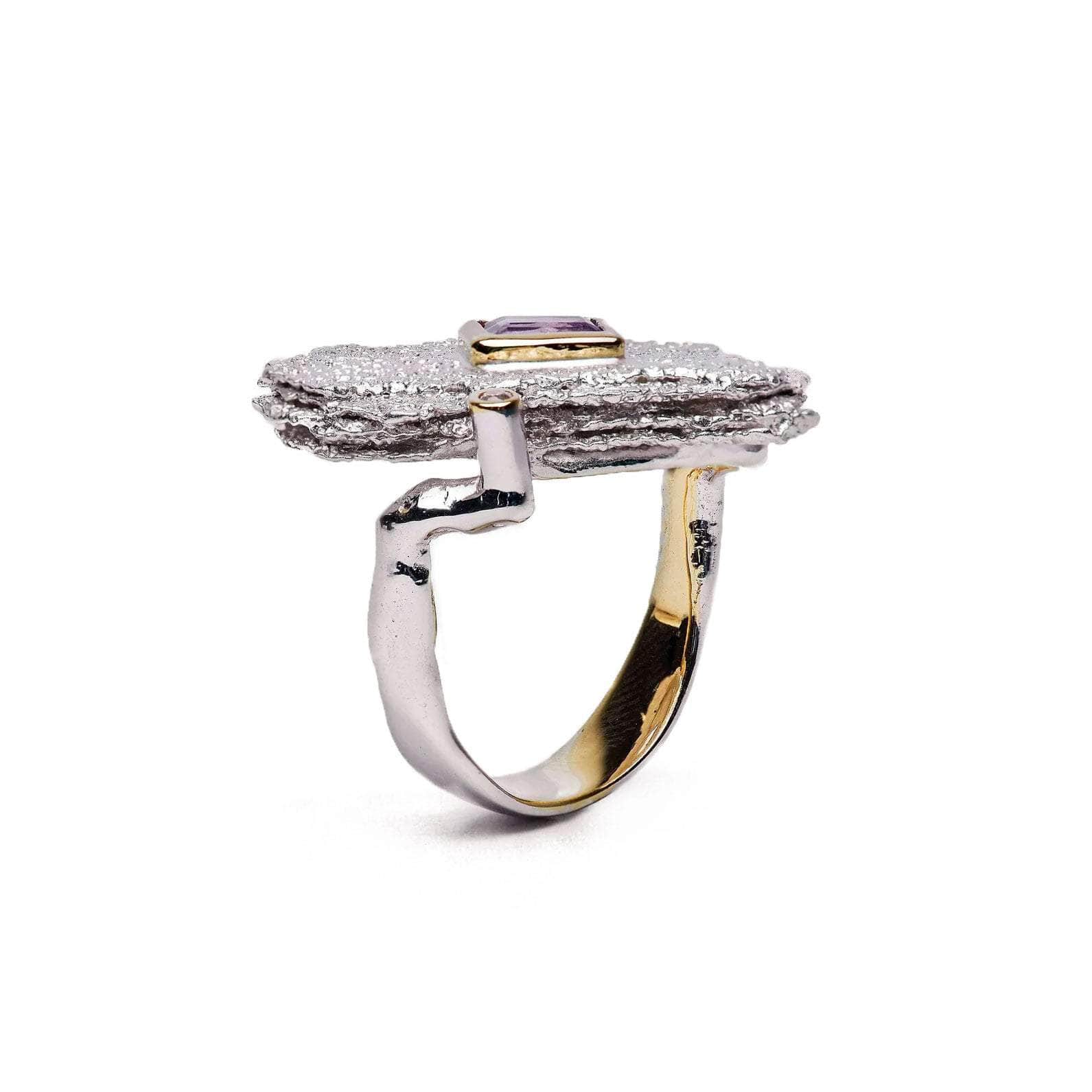 A striking purple amethyst is the central heartbeat of this stunning ring. It is made from a mixture of precious metals to combine together to create a conflicted harmony. Textured surfaces provide drama and impact. A delicate line of gold edges the precious central gemstone.
