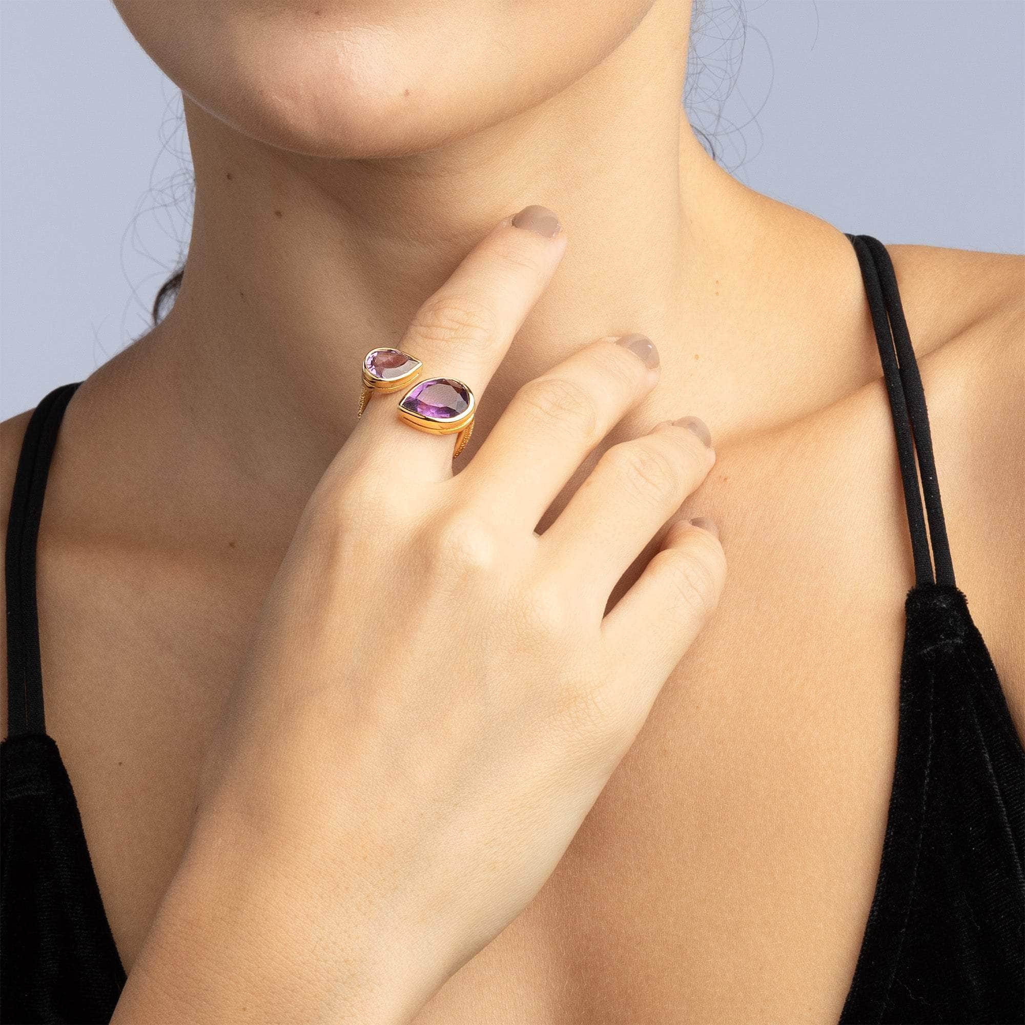 Introducing a standout piece from German Kabirski's latest Bacchus Bunch Collection: a minimalistic yet unconventional designer ring. This open band ring features an organic texture and a slightly curved design, offering a unique and edgy look and feel. Crafted from 925 Silver and plated with 18K Gold, it combines aesthetic flair with hypoallergenic comfort. Showcasing two natural pear-cut Amethysts, it adds a raw, artistic touch. Bold in its subtlety, this ring speaks to the wearer's inner individuality without being overly loud.