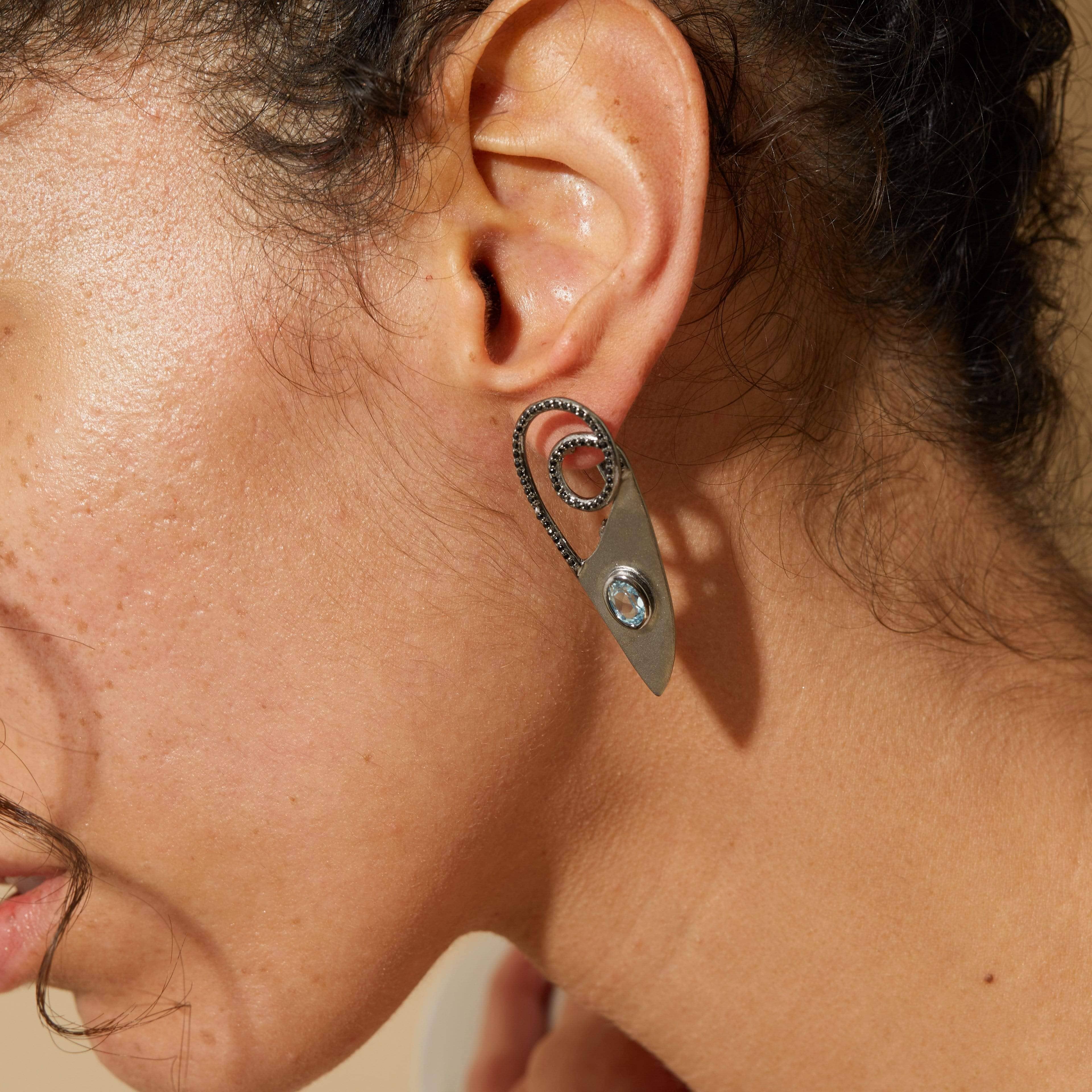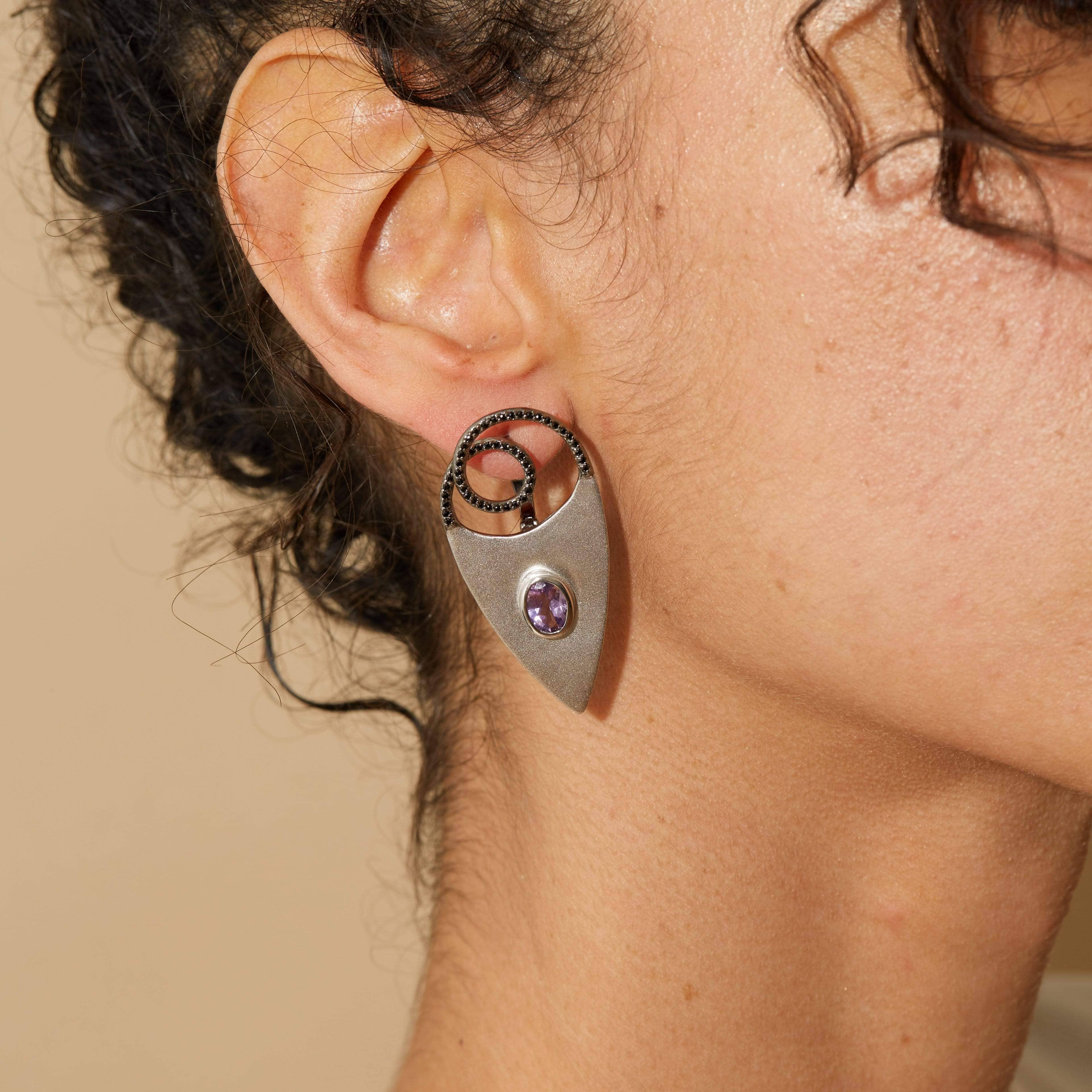 Trailing loops of black spinel gemstones create an arc of timeless beauty. Curving down into a natural points they are alluring and charming. A central amethyst and blue topaz create stunning contrast in these pretty earrings.