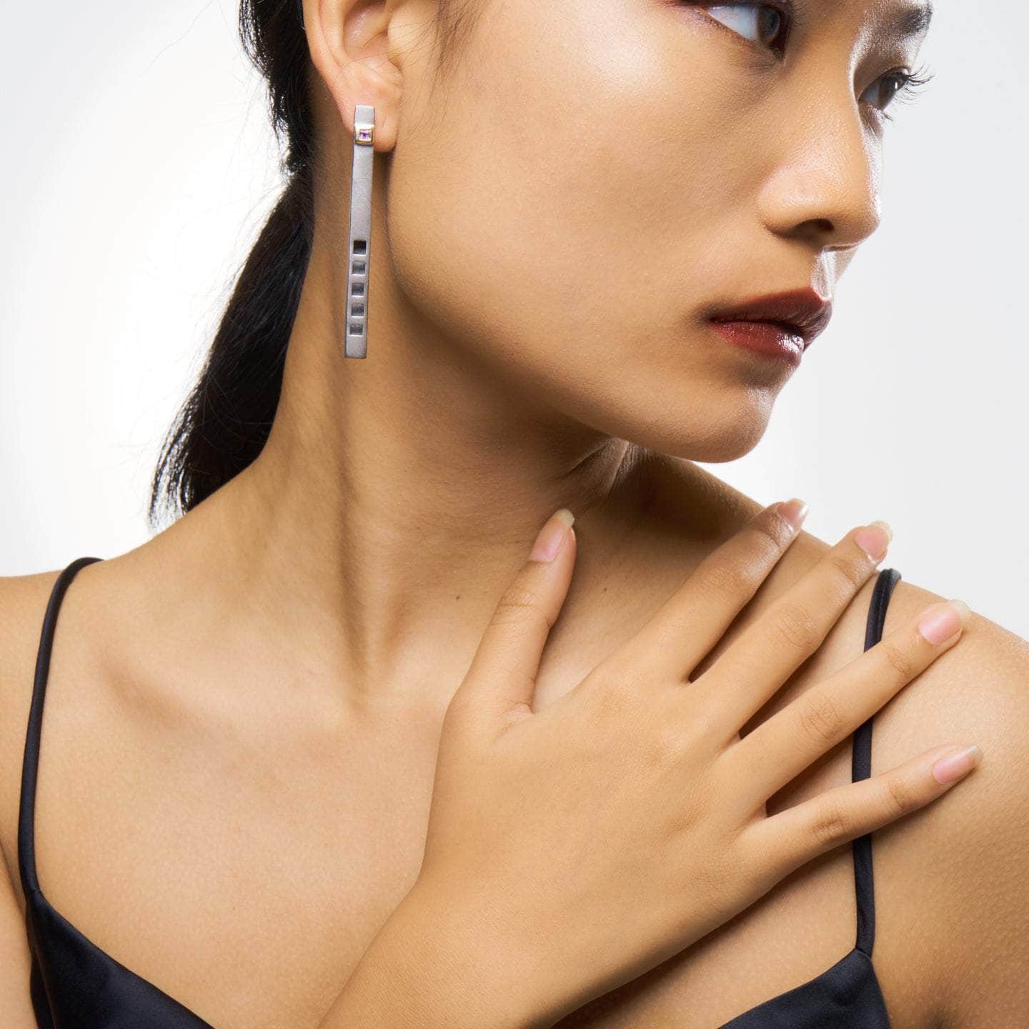 Set into each design is a natural amethyst, cut and placed to balance the architectural lines with color and calm. The stones offer a unifying element, but the shapes diverge - a quiet statement on individuality within connection.