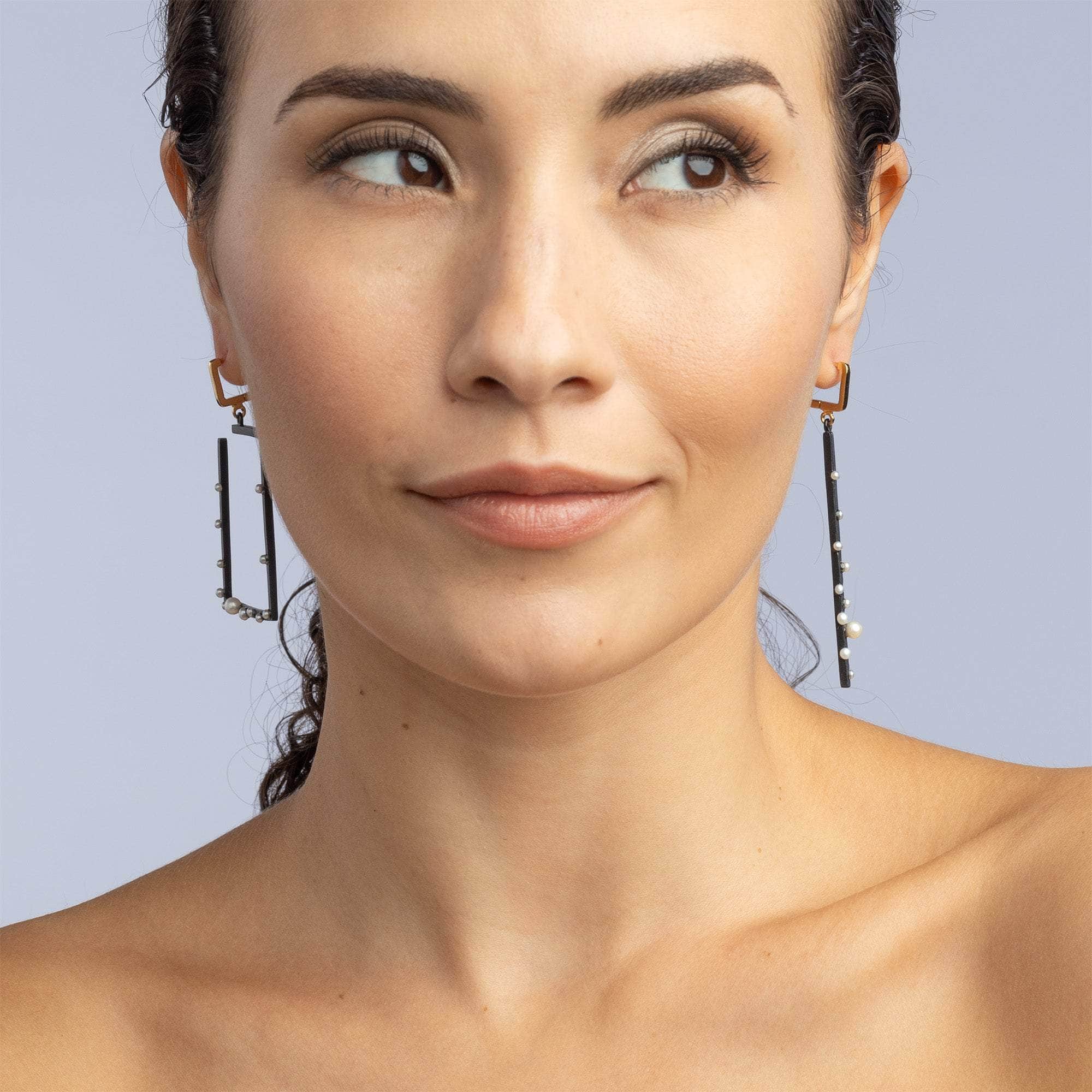 These unusual earrings from the Freakwater Pearl Collection feature a fresh and innovative geometric design. Asymmetrical and plated with black Anthracite on 925 silver, they contrast strikingly with scattered white micro pearls. Ideal for those who love contrast and authentic self-expression, these earrings make a unique style statement.